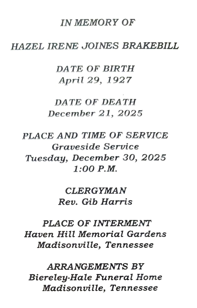 Hazel Irene Joines Brakebill, 98, died peacefully Sunday, December 21, 2025 after a long lifetime of love and happiness. Hazel was born in Madisonville, Tennessee to the late Jessie and Ross Joines. She grew up in Madisonville, TN where she attended Madisonville High School. She had 6 sisters: Huretta, Tommie, Harriette, Mildred, Jean and Nancy, 5 of whom preceded her in death. Hazel met and married Edward Harris Brakebill, who was a farmer and electrician. They had one child, Linda. The family moved to Nashville, where Edward worked for Ford Motor Company until his retirement. Hazel was a devoted wife and mother as well as worked several jobs from substitute teaching, to working in a five and dime. Edward preceded Hazel in death in 1997, after a brief struggle with cancer. Hazel then moved to Georgia to be near her daughter. There she enjoyed growing flowers, reading and tending to her great-grandchildren, who very much adored her. An active and humorous woman, she loved to do word puzzles, to play SORRY, to play checkers and to tell jokes. Strong in faith, she prayed read her Bible daily and passed on the importance of Christ in the lives of her family. Hazel loved the Lord and her family, and was a lively and passionate advocate for both. Her motto in life was “Accept and go on, and do the best we can.”